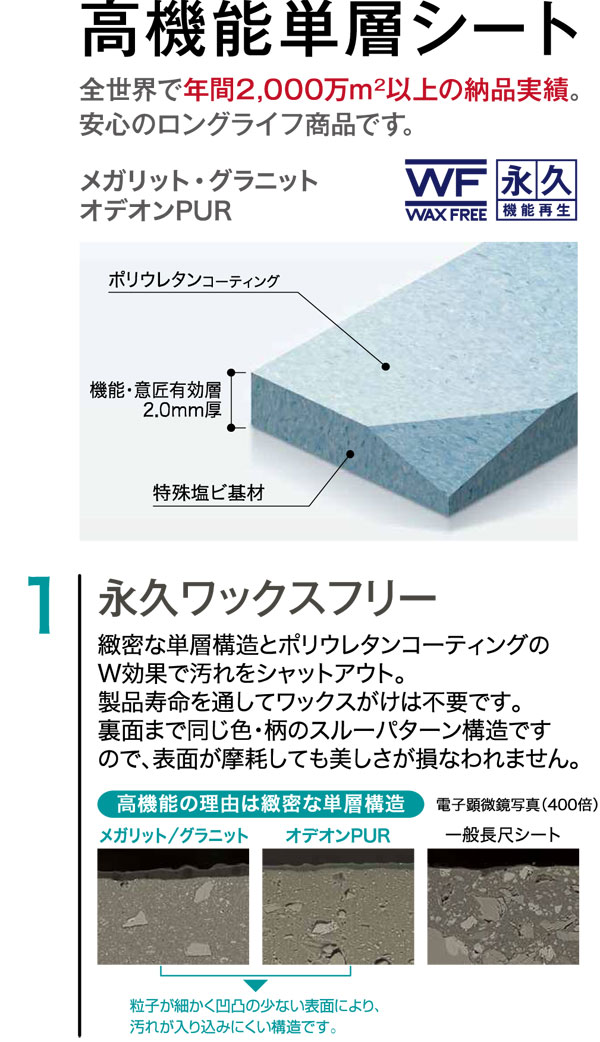 高機能単層シートは全世界で年間2,000万平方メートル以上の納品実績。