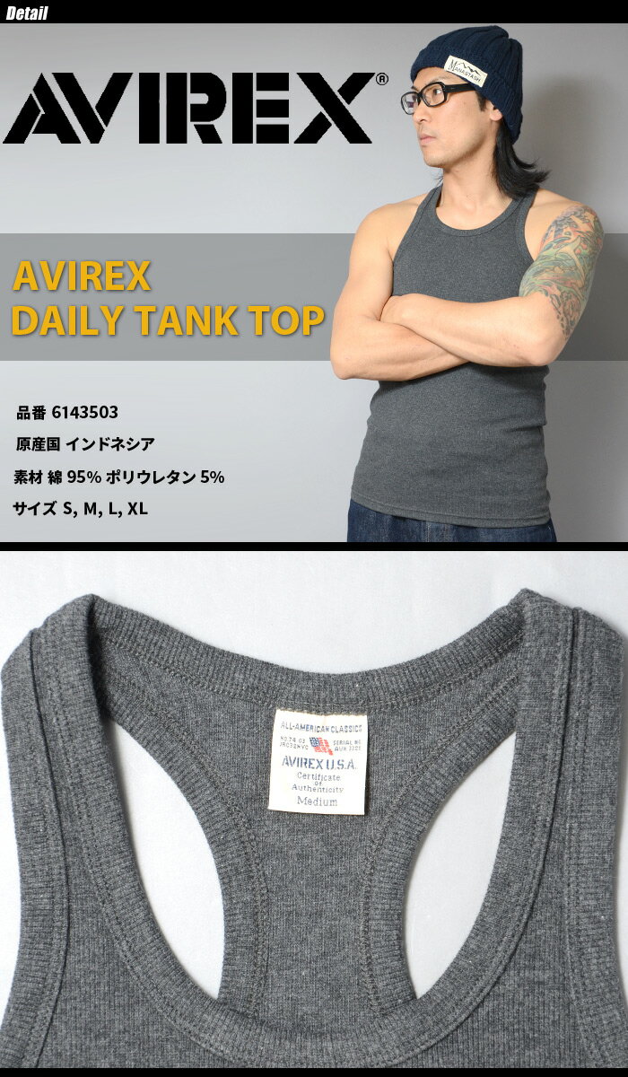 商品名 AVIREX(アビレックス) デイリー タンクトップ/ DAILY TANK TOP サイズ S/M/L/XL 採寸画像 モデル 身長176cm 体重75kg 着用サイズM カラー (01)WHITE/(09)BLACK/(14)GRAY/(19)CHACOAL 素材 綿95% ポリウレタン5% 生産国 インドネシア 注意事項 ●多店舗と在庫を共有しており、注文のタイミングにより売切れとなってしまう場合がございます。