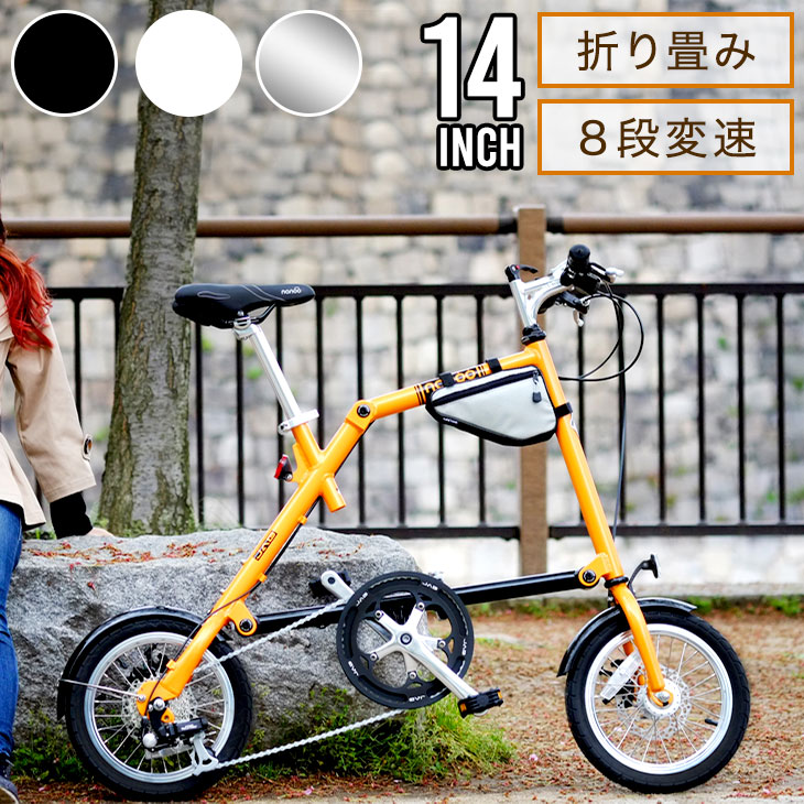 ★12時〜12H全品P5倍★【送料無料】1年保証 折り畳み自転車 14インチ 自転車 シルバー ブラック ホワイト オレンジ 街乗り シティサイクル コンパクト 自立 折りたたみ 折畳み おしゃれ 収納 軽量 通学 通勤 折りたたみ自転車 シマノ製 8段変速 【代引き・後払い不可】