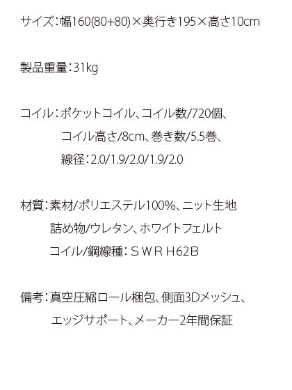 サイズ:幅160(80+80)×奥行き195×高さ10cm(マットレス2枚セット) 製品重量:31kg コイル:ポケットコイル、コイル数/720個、コイル高さ/8cm、巻き数/5.5巻、線径:2.0/1.9/2.0/1.9/2.0 材質:素材/ポリエステル100%、ニット生地 詰め物/ウレタン、ホワイトフェルト コイル/鋼線種:SWRH62B 備考:真空圧縮ロール梱包、側面3Dメッシュ、エッジサポート、メーカー2年間保証 カテゴリー:ポケットコイル/マットレス/ポケットコイルマットレス/高品質/低価格/リーズナブル/快眠/安眠/人気/シンプル/モダン/北欧/ナチュラル/保証付き/bed/ベット/白/SALE/セールトップ > マットレス > スリムプレミアム ポケットコイルマットレス Qサイズ サイズ: 幅160(80+80)×奥行き195×高さ10cm(マットレス2枚セット) 製品重量: 31kg コイル: ポケットコイル、コイル数/720個、コイル高さ/8cm、巻き数/5.5巻、線径:2.0/1.9/2.0/1.9/2.0 材質: 素材/ポリエステル100%、ニット生地 詰め物/ウレタン、ホワイトフェルト コイル/鋼線種:SWRH62B 備考: 真空圧縮ロール梱包、側面3Dメッシュ、エッジサポート、メーカー2年間保証