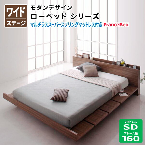 【送料無料】 ローベッド 棚付き コンセント付き FRANCLIN フランクリン マルチラススーパースプリングマットレス付き マットレス:セミダブル ワイドステージ フレーム幅160 すのこベッド フロアベッド ウォールナット